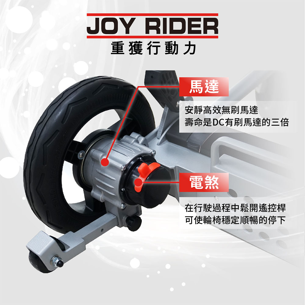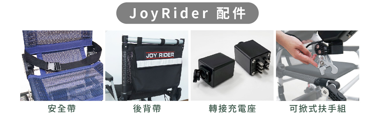 Joy Rider 擁有德國 Red Dot Design 大獎、日本 G-Mark及兩項美國專利;設計師及台灣生產廠方以歐盟規格CE生產、符合「ISO 7176」、「EN 12184」及「California TB-117」 等國際測試,包括多項撞擊、電池及防火測試的超輕輪椅。