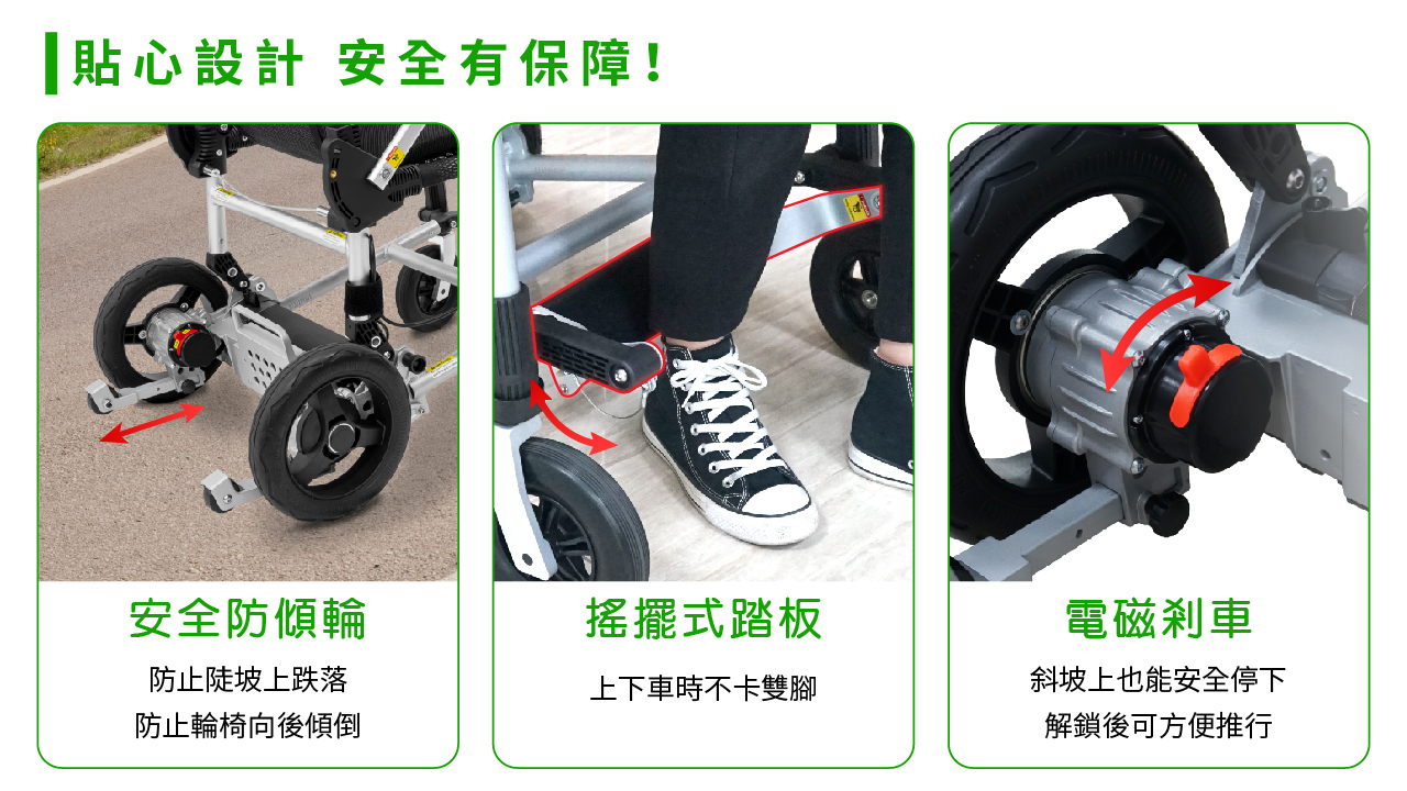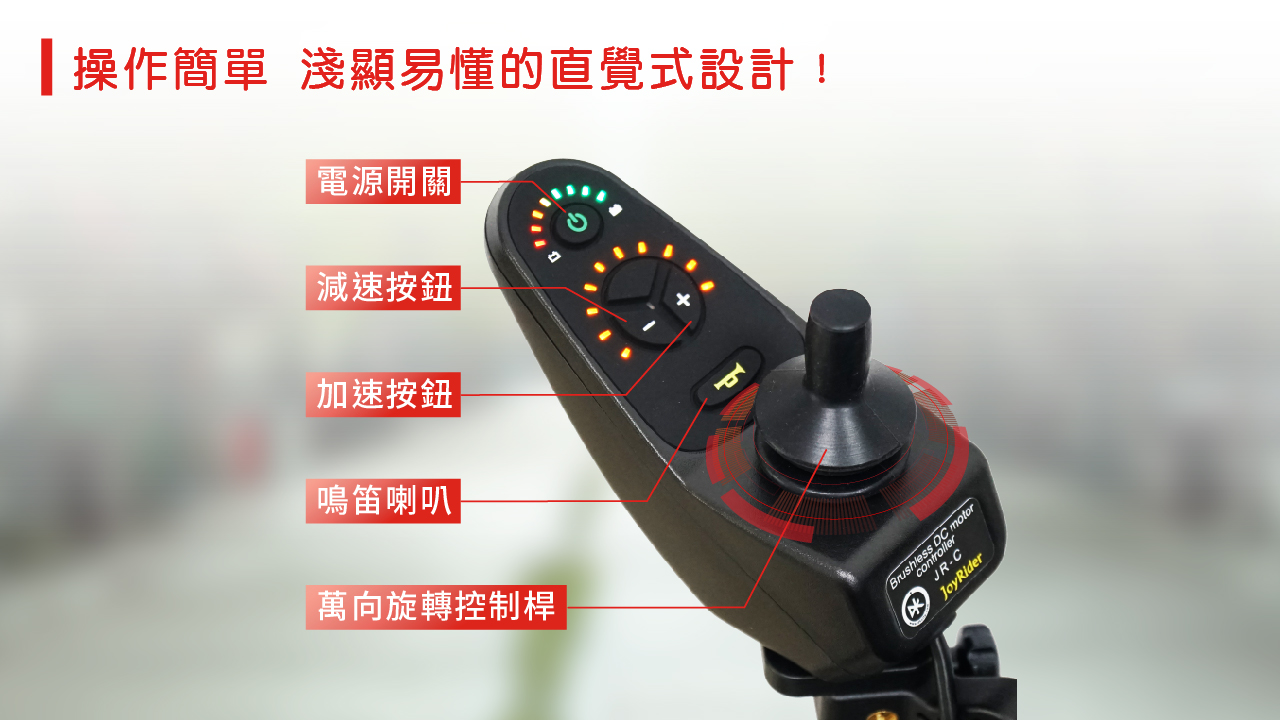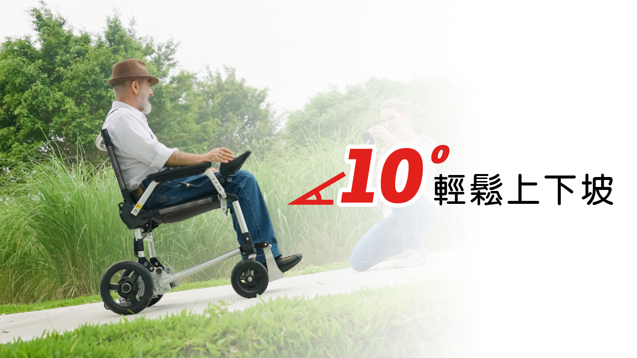 - 上下斜坡時,只需鬆開操縱桿,即可停車,安全又方便,適合輪椅新手使用