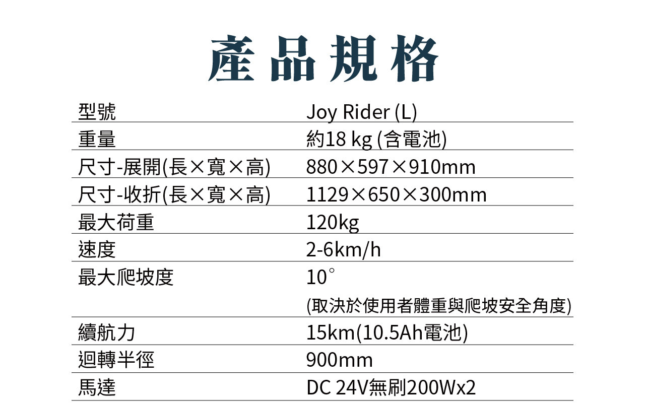 最大爬坡:10°(取決於使用者體重與爬坡安全角度)